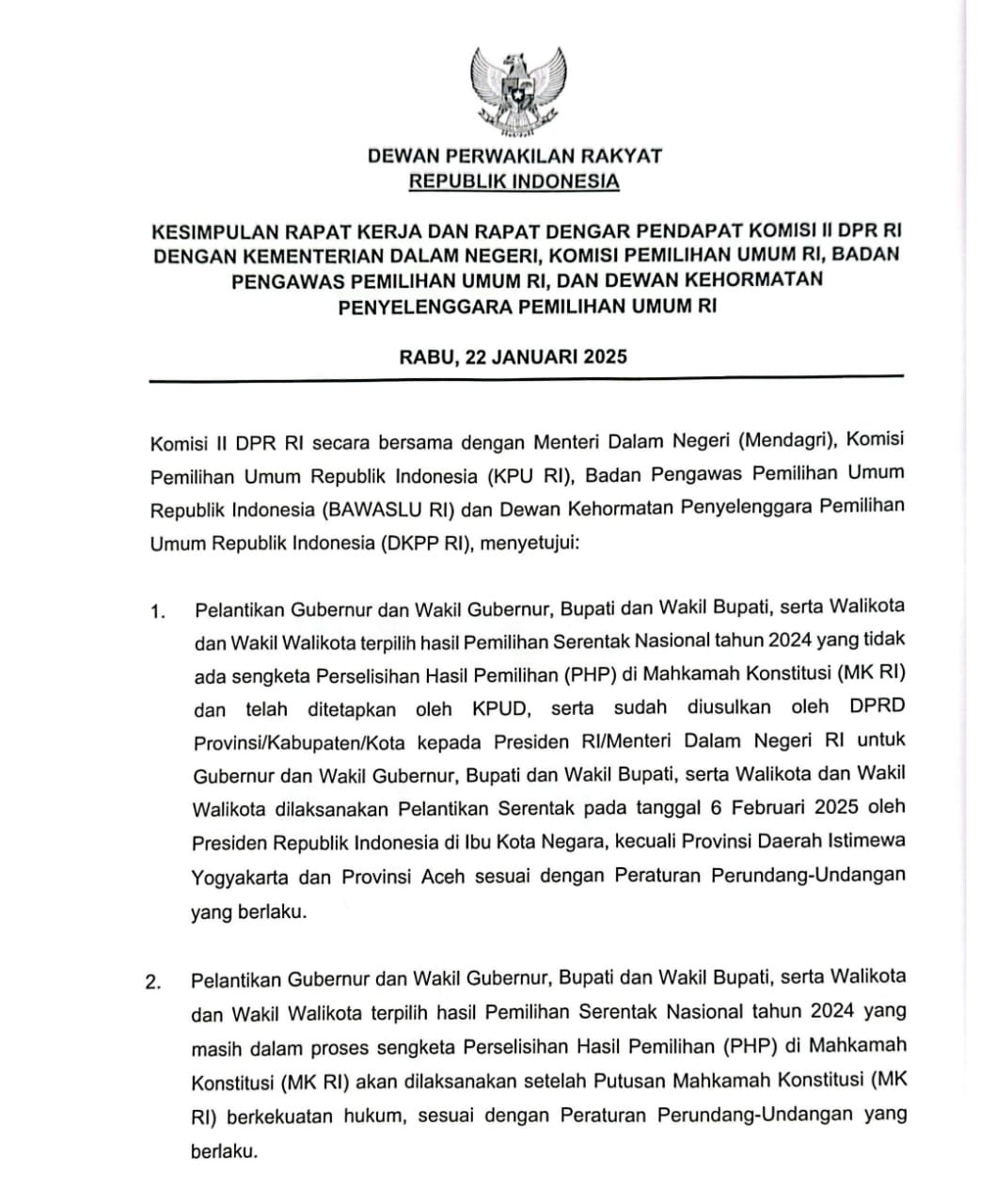 Hal tersebut diketahui setelah terbitnya surat dengan kop Dewan Perwakilan Rakyat Republik Indonesia (DPR RI) tertanggal 22 Januari 2025 tentang kesimpulan rapat kerja dan rapat dengar pendapat Komisi II DPR RI dengan Kementerian Dalam Negeri, Komisi Pemilihan Umum RI, Badan Pengawas Pemilu RI, Dewan Kehormatan Penyelenggara Pemilihan Umum RI.