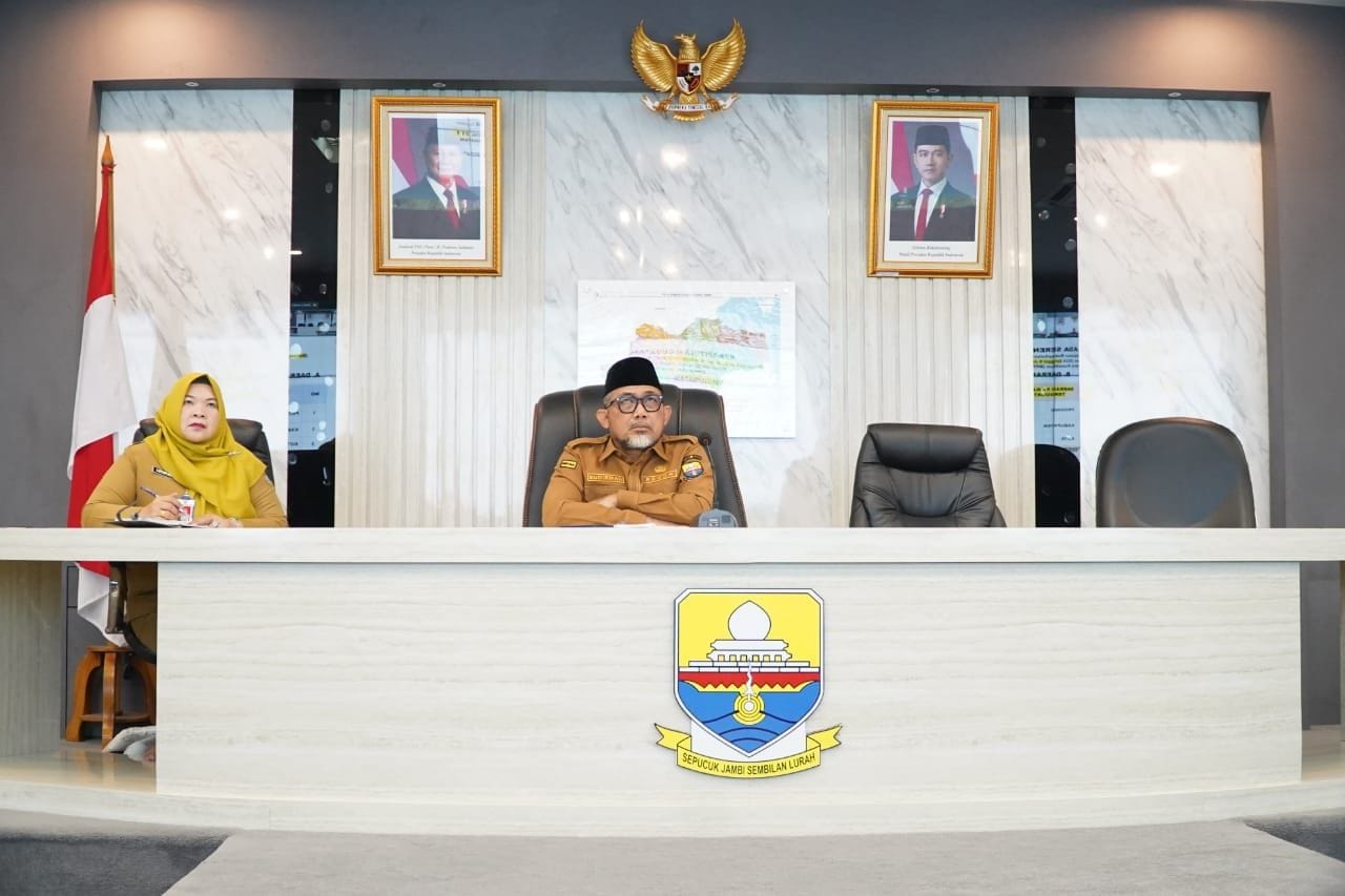 Jambi – Sekretaris Daerah (Sekda) Provinsi Jambi Dr. H. Sudirman, SH, MH bersama Ketua DPRD (Dewan Perperwakilan Rakyat Daerah) Provinsi Jambi M. Hafiz, Asisten II Setda Provinsi Jambi Arif Munandar dan Kepala Biro Pemerintahan Setda Provinsi Jambi Luthpiah mengikuti Zoom Meeting bersama Menteri Dalam Negeri (Mendagri) Republik Indonesia Tito Karnavian dengan agenda Rapat Pelaksanaan Pelantikan Serentak Gubernur-Wakil Gubernur, Bupati-Wakil Bupati dan Wali Kota-Wakil Wali Kota Hasil Pilkada Serentak Tahun 2024, bertempat di Ruang Jambi Data Analytic Centre (JDAC) Kantor Gubernur Jambi, Senin (03/02/2025) pagi.