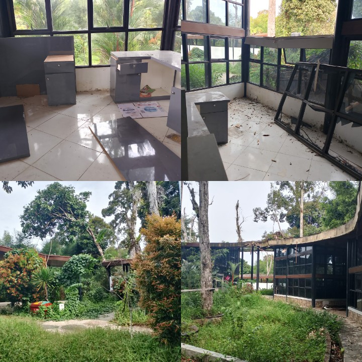 Pantauan awak mediadi lapangan, rumput tumbuh subur di lokasi taman, lampu-lampu penerangan banyak yang rusak, belum lagi atap seng terlihat bocor akibat tertimpa pohon, plafon banyak jebol, ruangan cafe pintu kacanya terbuka, meja dan lemari berantakan. Belum lagi buku-buku berserakan di kursi, dan nyaris tak tersentuh perawatan.